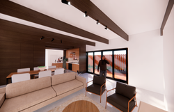 Duplex Dwelling interior design and plan of unit that brings indoor and outdoor activities together. Kitchen and living expanded and creation of unique moments in unit that creates memorable moments and value in efficiency and planning of new living space
